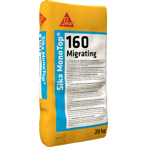 Sika MonoTop®-160 Migrating jest jednoskładnikową powłoką uszczelniającą na bazie cementu zawierającą odpowiednio dobrane kruszywo i dodatki chemiczne. Aktywne składniki migrują w pory i kapilary betonu, i reagując z dostępną wodą i niezwiązanym wapnem tworzą nierozpuszczalną sieć krystaliczną. Powłokę można nakładać za pomocą pędzla lub metodą natrysku, a powstała warstwa zabezpiecza beton przed wnikaniem i penetracją wody.